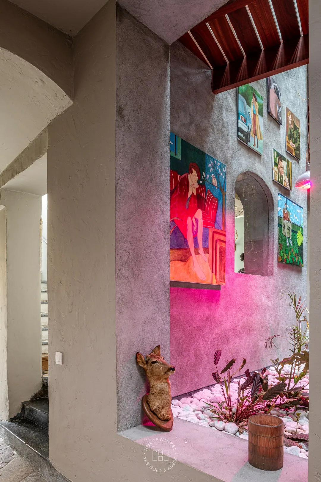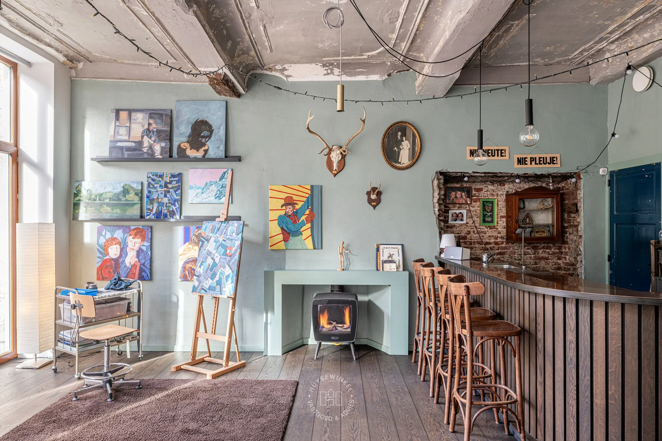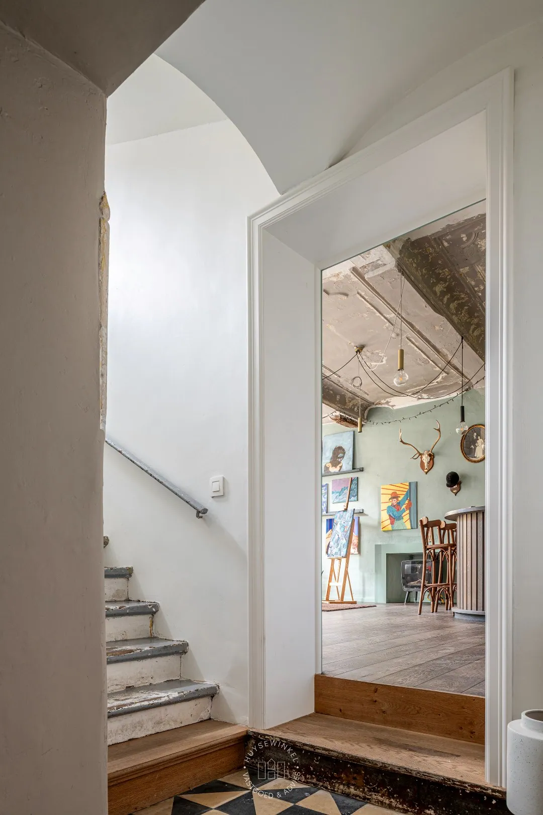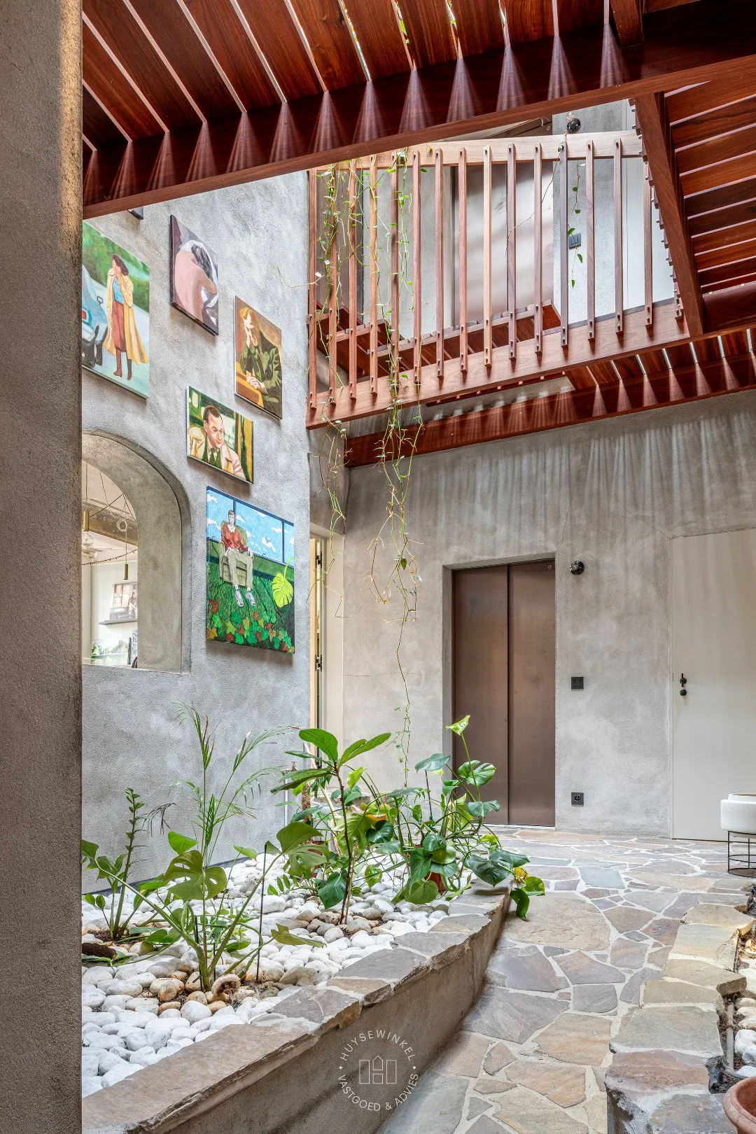 De oude kelder, met zijn bakstenen gewelven, verwijst volgens overlevering naar de tijd waarin hier een brouwerij gevestigd was — opnieuw een stukje Gentse geschiedenis dat elegant geïntegreerd werd in de renovatie.