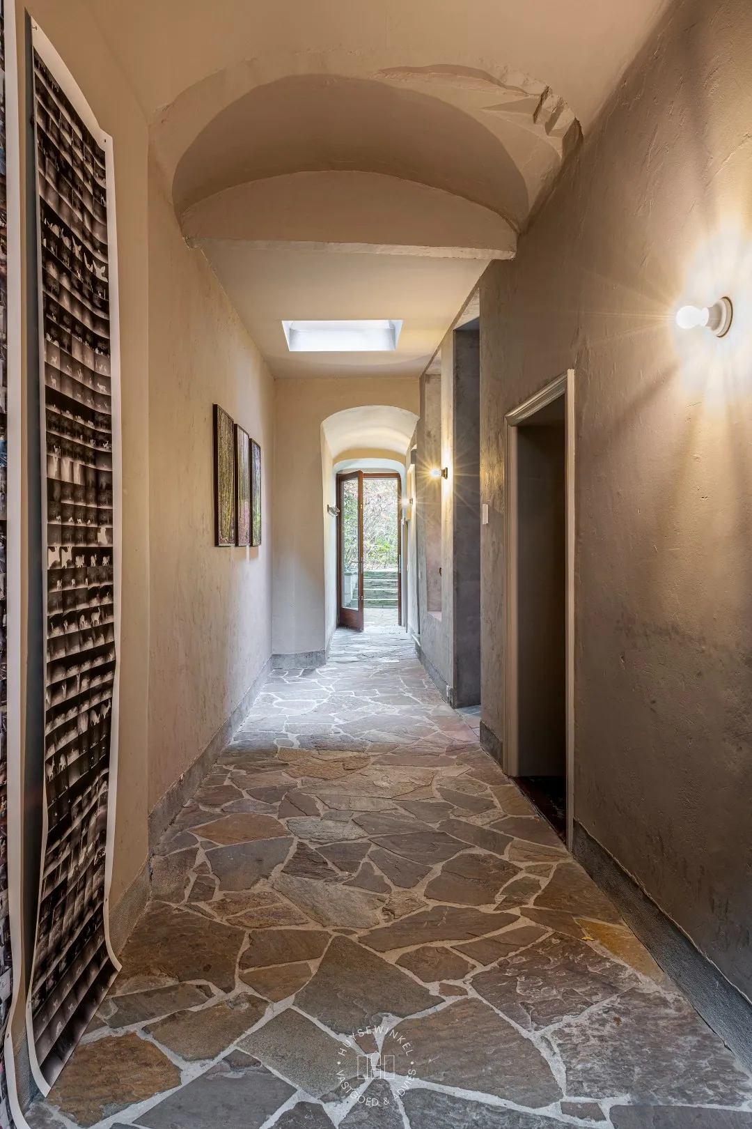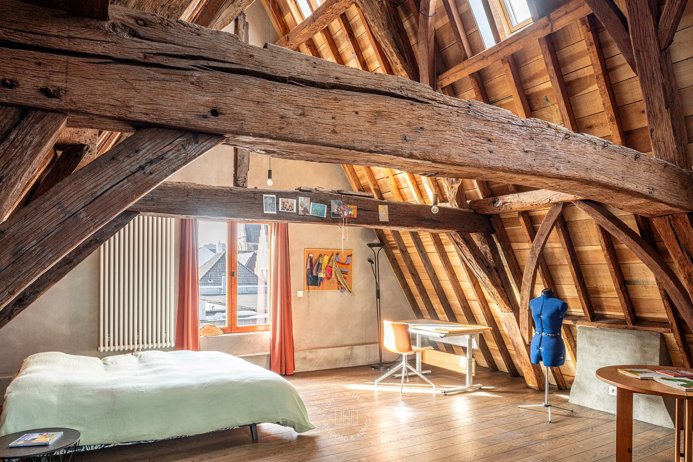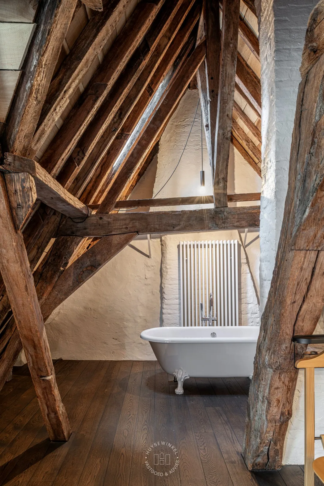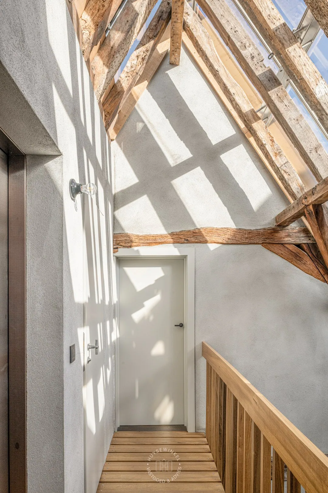 Het interieur ademt authenticiteit dankzij zorgvuldig bewaarde elementen zoals de 17e-eeuwse balken die de leefruimte een warme, bijna verhalende sfeer geven. Onder het huis liep ooit een klein straatje — een stuk geschiedenis dat nieuw leven kreeg via een pad in leisteen, dat vanuit de gang in het voorhuis doorloopt tot aan het uitnodigende terras en de zonnige tuin.