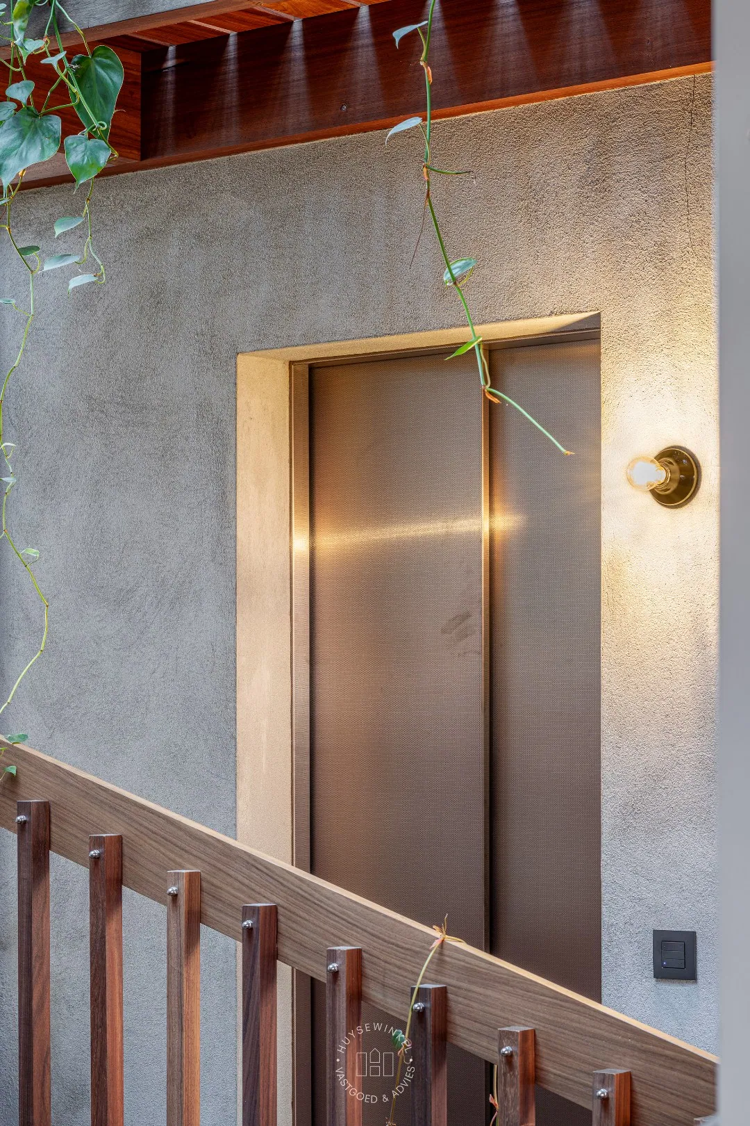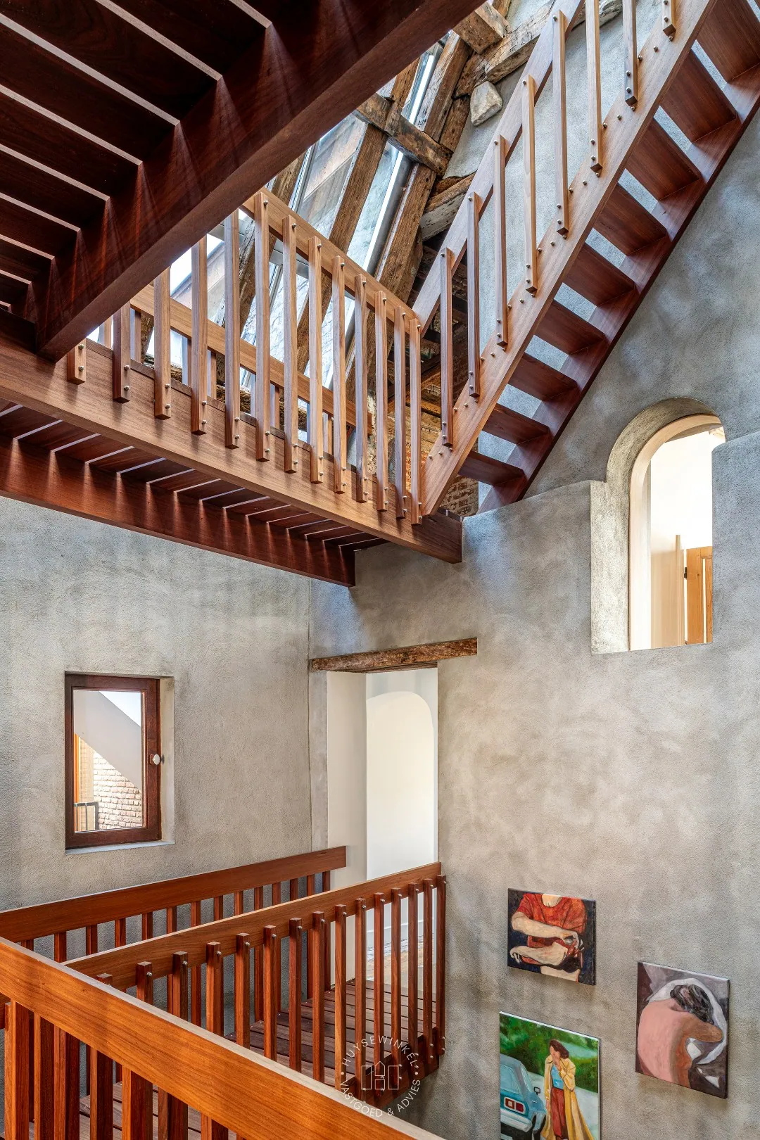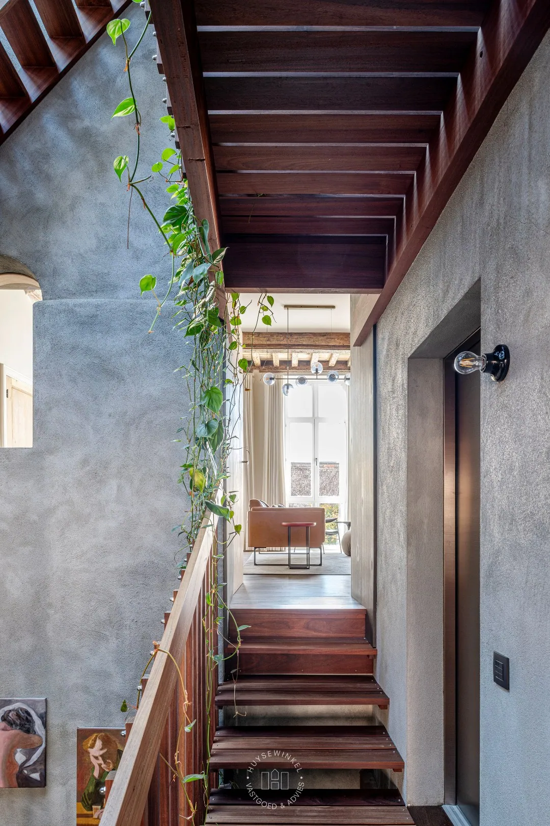 Tussen beide oorspronkelijke panden werd naast een personenlift ook een Escher-achtige trap gecreëerd: een architecturaal kunstwerk dat verschillende niveaus en loopbruggen op een speelse, ruimtelijke manier met elkaar verbindt. Deze ingenieuze constructie geeft het huis een unieke dynamiek en ruimtelijke spanning.