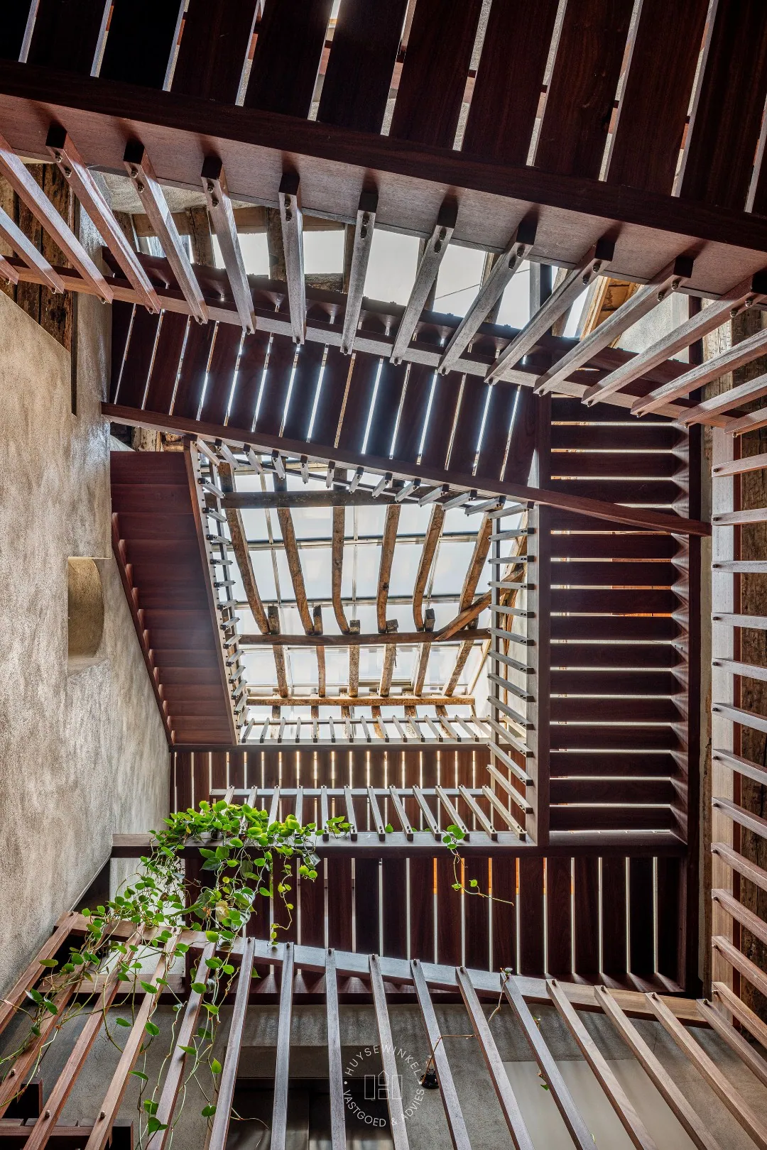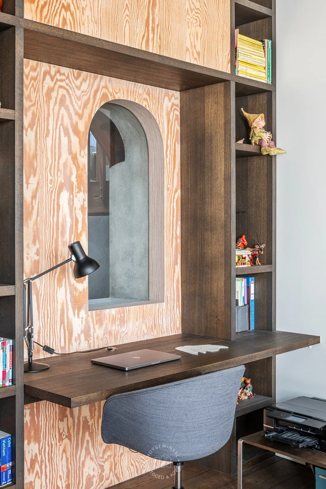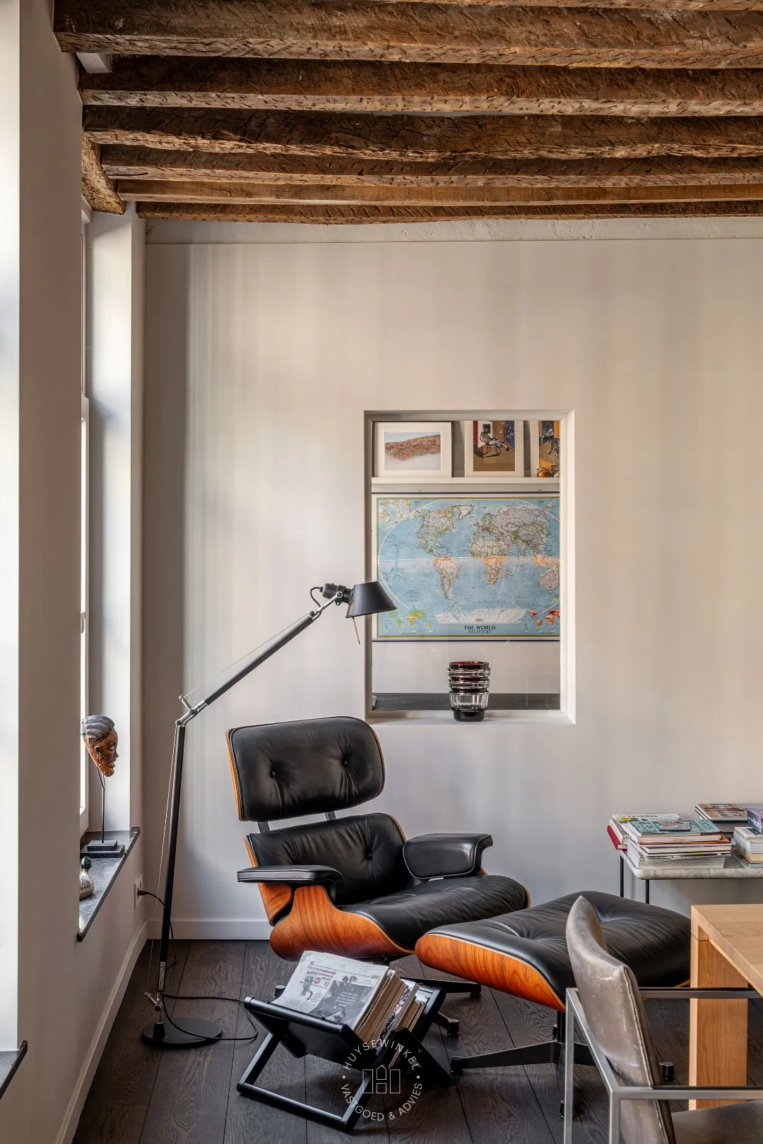 Tussen beide oorspronkelijke panden werd naast een personenlift ook een Escher-achtige trap gecreëerd: een architecturaal kunstwerk dat verschillende niveaus en loopbruggen op een speelse, ruimtelijke manier met elkaar verbindt. Deze ingenieuze constructie geeft het huis een unieke dynamiek en ruimtelijke spanning.